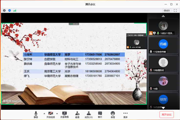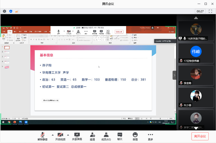 此次考研交流会以腾讯会议为载体,分应用物理学专业,统计学专业,声学专业三个专场举行。每个专业根据自己专业情况分享考研等心得。学院200余名学生参与了此次活动。