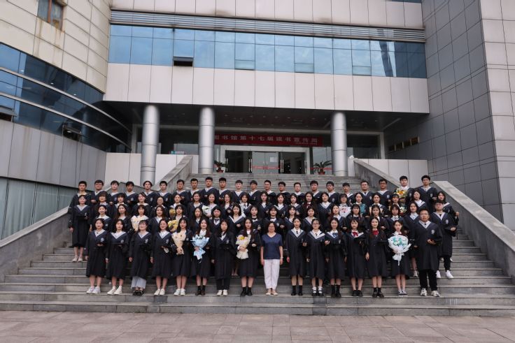 图书馆前毕业生们站立整齐,身着学士服,听从摄影师的指挥,以班级为单位依次进行集体合照。