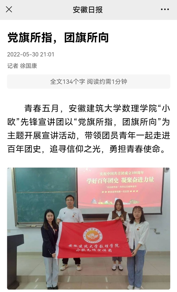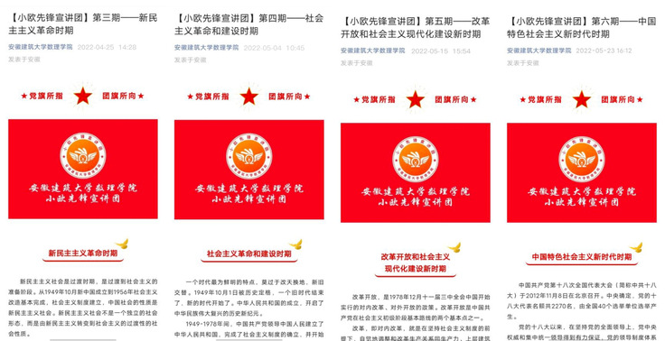 习近平总书记指出:一个民族要走在时代前列,就一刻不能没有理论思维,一刻不能没有正确思想指引。2022年,学院坚持用党的创新理论教育引导青年大学生,强化思想共识。采取线上线下相结合的方式,组织学生开展“悦读·习语”“Ω文化节”等特色活动,从最初的分享“自己最喜爱的习近平总书记一句话”拓展到以“讲党史、讲党章、讲故事、讲体会、讲践行”为核心理念的党旗下的“五讲”。为形成常态化学习机制,2022年初,学院成立“小欧”先锋宣讲团,选拔培训优秀党员,从青年学子的视角,结合党史、团史,开展党的创新理论宣讲,5月30日,安徽建筑大学数理学院“小欧”先锋宣讲团开展的“党旗所指,团旗所向”百年团史宣讲活动被安徽日报报道。通过理论学习,使青年学子们深刻认识到,坚持党的全面领导是坚持和发展中国特色社会主义的必由之路,中国特色社会主义是实现中华民族伟大复兴的必由之路,团结奋斗是中国人民创造历史伟业的必由之路,贯彻新发展理念是新时代我国发展壮大的必由之路,全面从严治党是党永葆生机活力、走好新的赶考之路的必由之路。