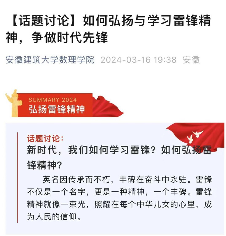 为纪念雷锋同志并弘扬雷锋精神,数理学院新媒体中心在微信公众号上开展雷锋精神话题讨论活动。