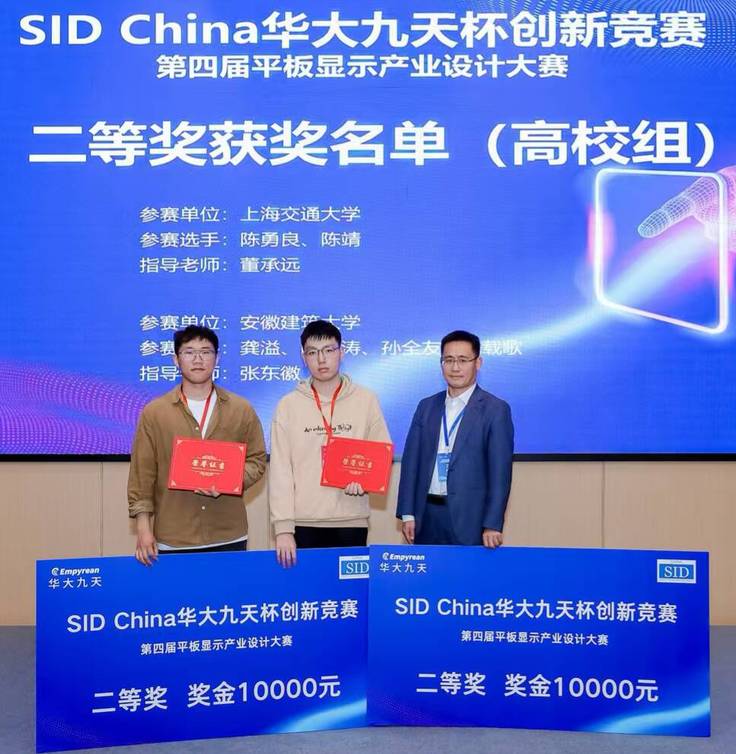 本网讯 近日,由安徽建筑大学数理学院张东徽博士指导,龚溢、叶飞扬等6名本硕学生组成的跨学院团队,在国际信息显示学会中国区(SID China)主办的两项全国性显示技术顶级赛事中捷报频传:先后斩获第五届ICDT新型显示技术竞赛优胜奖、第四届 “华大九天杯” 创新竞赛二等奖,累计揽获奖金1.5万元。此次连续获奖不仅彰显了我校学子在前沿技术领域的科研创新实力,更印证了数理学院“本硕协同跨域创新”人才培养模式的显著成效,为学校在显示技术创新领域赢得了行业认可。