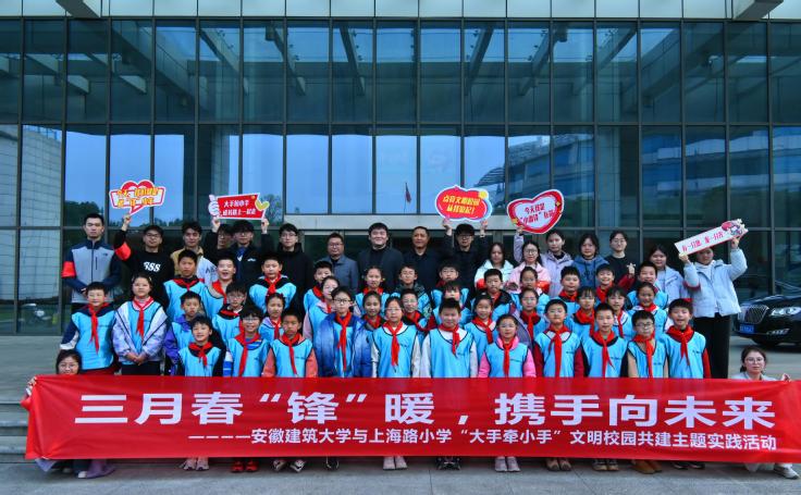 本网讯 春潮澎湃,暖意融融。为深入学习贯彻习近平总书记关于弘扬雷锋精神的重要指示精神,践行志愿服务理念,提升校际协同育人实效,3月20日,由安徽建筑大学党委宣传部、学工部(学生处)、招生就业处、保卫处、后勤基建处、团委、图书馆、数理学院与上海路小学联合举办的“三月春‘锋’暖,携手向未来——‘大手牵小手’文明校园行主题实践活动”顺利开展。两校六十余名师生代表共同参与,以实际行动践行初心,以温暖携手凝聚合力,为文明校园建设注入蓬勃的青春能量。