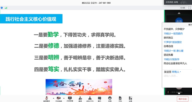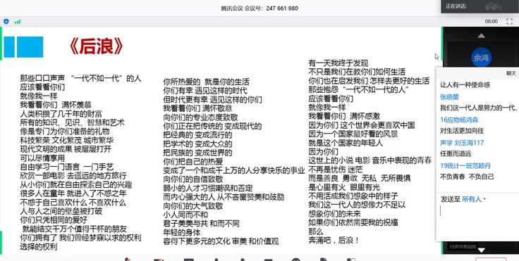 余鸿以“奔涌吧,后浪”为主题,在《后浪》嘹亮的朗诵声中拉开本次党课的帷幕。声毕,同学们深受感染、激情澎湃,在聊天区域畅谈自己的想法。