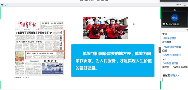 余鸿在党课开篇点出2020年春天的关键词是“感动”,带领大家共同学习习近平总书记写给北京大学援鄂医疗队全体“90后”党员的回信,解读青年一代在战疫中的责任与担当。她表示,新时代青年是在祖国繁荣强盛时期长大的一代,爱国之情早已深深扎根于心。面对来势汹汹的疫情,他们把祖国的安危看作比自己的生命还重要,把浓浓的爱国之情化作坚定的报国之行。对战“疫”一线的90后、00后青年,她评价道:“曾经世界守护着他们,如今他们守护着世界”。随后,齐唱的一曲《国家》将党课推向高潮。