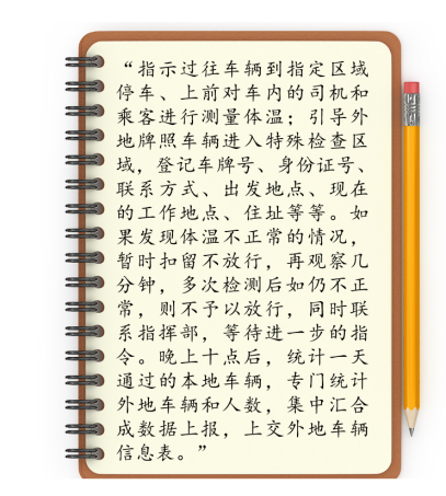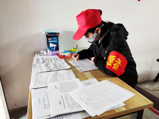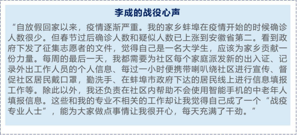 安徽潜山 18级城市地下空间工程专业的刘梦琼从正月初二开始就帮助母亲登记需要购买感冒药、发热药物人员的工作,每天整理信息并反馈到上级指挥部门。后来,她又加入到路口登记员的队伍中,负责出入来往人员的身份核查和登记工作。