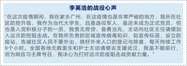 广东广州 18级土木工程专业二班的李英浩2016年就考入了安徽建筑大学,但在入学报到和入伍之间,他选择了先去圆那个“当兵梦”。保家卫国是他打小就根植在心中的梦想。退伍回来继续念大学的他,依旧保持着军人自律、坚强的好习惯。这次的疫情最初在他的家乡广州市蔓延的很快。他主动联系了社区,报名志愿服务,希望能用自己的力量帮助更多的人、保护更多的人。