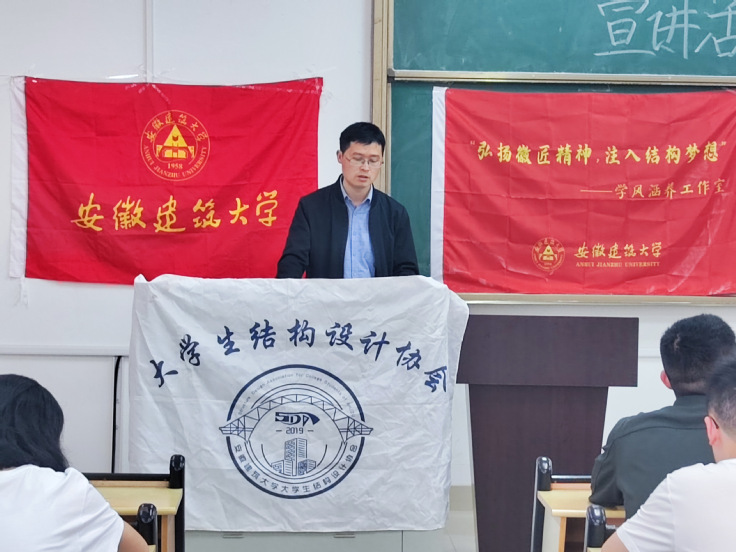 活动由土木学院大学生结构设计协会指导老师和“弘扬徽匠精神,注入结构梦想”学风涵养工作室负责人郝英奇、康小方老师担任主讲嘉宾。郝英奇结合历届参赛作品对全国大学生结构设计竞赛的主要内容、参赛资格、往年成果和报名途径进行详细解读,康小方结合往年赛题细致介绍比赛的加载方式、加载装置、模型大小与重量、材料及工具等。两位老师强调参赛对提升个人综合素质的意义和对专业学习起到的重要作用,鼓励同学们努力奋进,积极备赛。