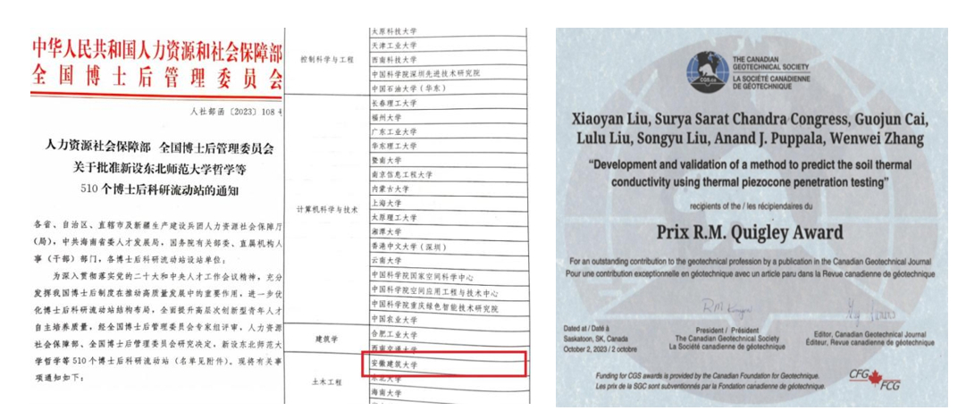 聚能成势 学科发展创造新历史 学院党委充分发挥党建引领和示范作用,推进党建工作和学科发展“双融合、双促进”,努力开创高质量党建护航高水平学科建设的良好局面。以学科建设为龙头,新设学科建设办公室,重点抓人事人才和学科建设工作。2023年,学院学科建设取得新的突破,土木工程高峰学科综合评价为优秀;博士点开始招生;学校首个博士后科研流动站—土木工程博士后科研流动站获批。以学科特区为引领,对标国家一流学科标准,以体制机制创新为路径,以具有高显示度的科研成果为目标,结合国家重大战略和安徽省重点新兴产业需求,凝练学科攻关方向,在重大项目研发及关键技术等方面发力,形成具有较大国内影响力和核心竞争力的优势学科方向,蔡国军教授团队发表论文荣获2023年“R.M.Quigley奖”。