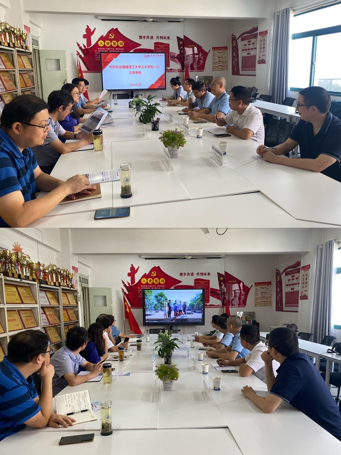 王媛对黄志铭一行的来访表示热烈欢迎,介绍了我院的历史沿革、学科发展和近些年在党建等方面取得的成果。张宁对学院教学、科研近两年的发展以及取得的成就等做了介绍。吴德义围绕博士点建设进行了交流。黄志铭对我院的热情接待表示感谢,双方一起观看了福建理工大学土木学院的宣传片,希望在党建教育、博士点建设、本科教育教学审核评估、专业认证、研究生培养、科研平台建设、行政管理等方面互相交流,学习宝贵经验和做法。
