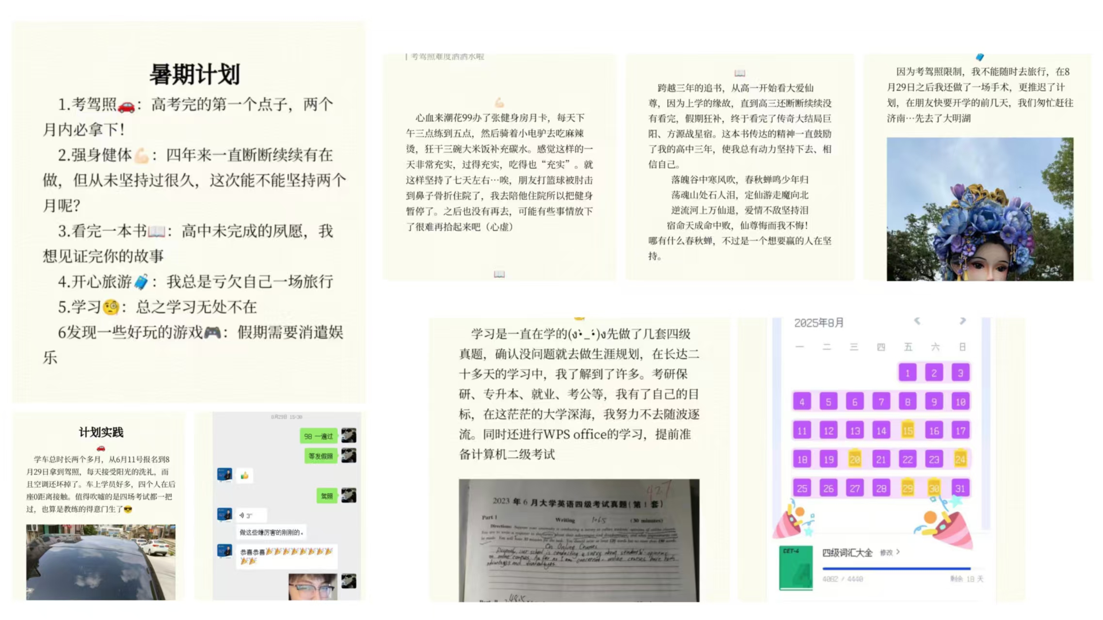 在计划制定阶段,同学们积极响应,根据自身情况,制定了涵盖学习提升、社会实践、兴趣培养、家庭互动等多方面的暑期计划。有的学生计划阅读专业书籍、学习新技能或备考证书,以提升自身竞争力;有的学生选择参加志愿者活动、实习工作或社会调研,以积累实践经验、了解行业动态;还有的学生培养绘画、音乐、摄影等兴趣爱好,或学习游泳、骑行、打球等新运动,以强身健体、丰富生活。