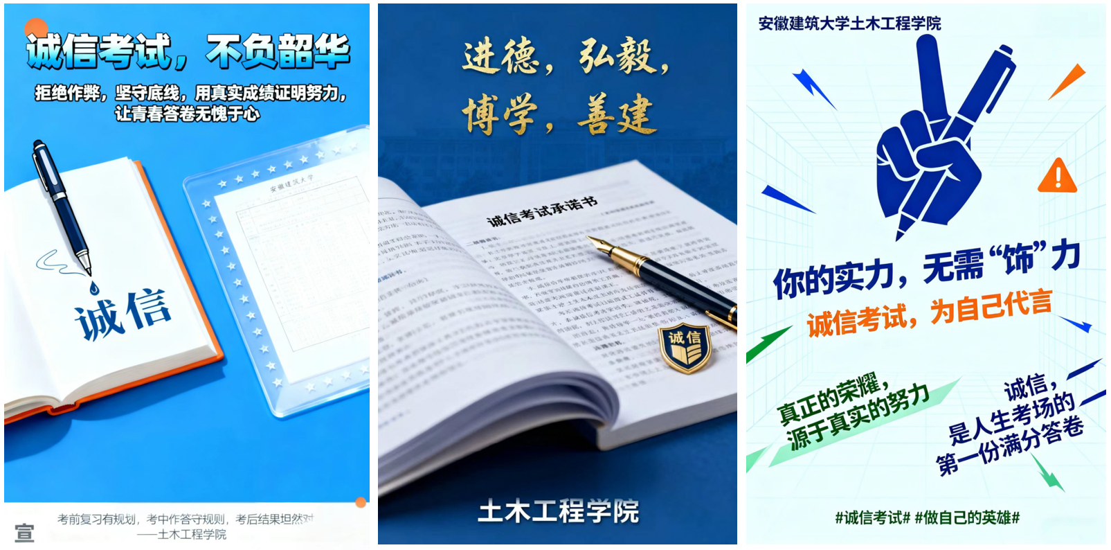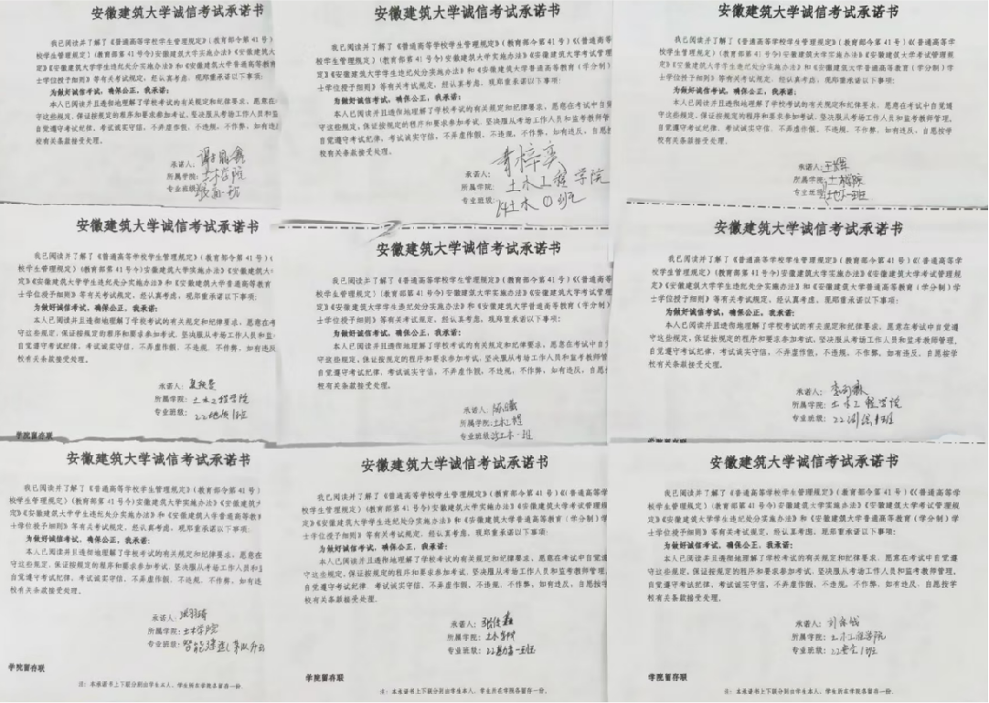 本网讯 为进一步加强学风建设,引导学生树立诚信考试理念,营造公平公正、风清气正的考试氛围,土木工程学院开展了以“争做诚信考生,共建优良考风”教育活动,通过主题班会、签订承诺书、海报设计及签名等形式,引导全体学生树立诚信应考意识,筑牢道德防线。 主题班会传理念 诚信意识入人心 为将诚信理念转化为实际行动,各班级召开诚信考试主题班会,辅导员们结合《国家教育考试违规处理办法》《安徽建筑大学学生违纪处分实施办法》等规章制度,结合典型违纪案例,向同学们详细解读了考试作弊的认定标准、处理流程及严重后果。从“一念之差”导致的学业危机,到诚信缺失对个人成长的长远影响,一个个真实案例让同学们深刻认识到诚信考试的重要性。
