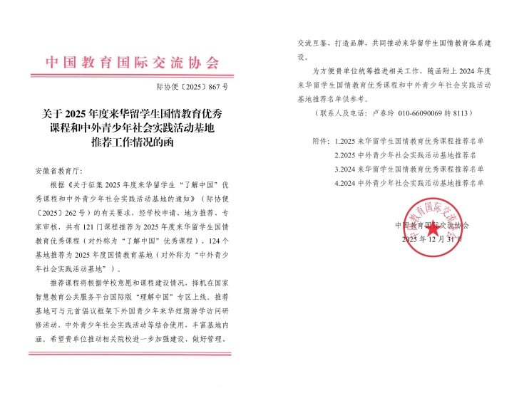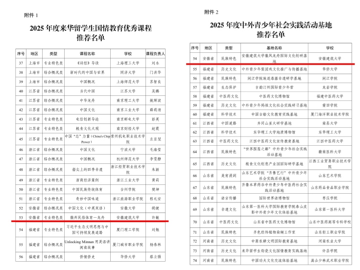 本次“一课程一基地”双双入选国家级推荐名单,是安徽建筑大学深入贯彻落实来华留学生国情教育体系建设的重要成果,也是学校依托地域文化优势、推进国际化人才培养的创新实践。近年来,学校高度重视来华留学生教育,将国情教育有机融入人才培养全过程,积极整合徽文化等地域特色资源,着力打造一批文化底蕴深厚、实践特色突出、国际视野鲜明的精品课程与实践平台。