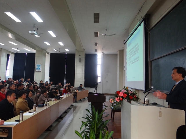 本网讯 12月5日下午,国务院学位委员会学科评议组成员、二语习得领域知名专家、广东外语外贸大学博士生导师王初明教授光临我校,应外语系邀请,举行 “如何提升外语教学和学习效率”学术讲座。讲座由外语系主任林莉兰主持,合肥工业大学、安徽医科大学、合肥师范学院、合肥学院和我校外语系师生济济一堂,共襄学术盛会。