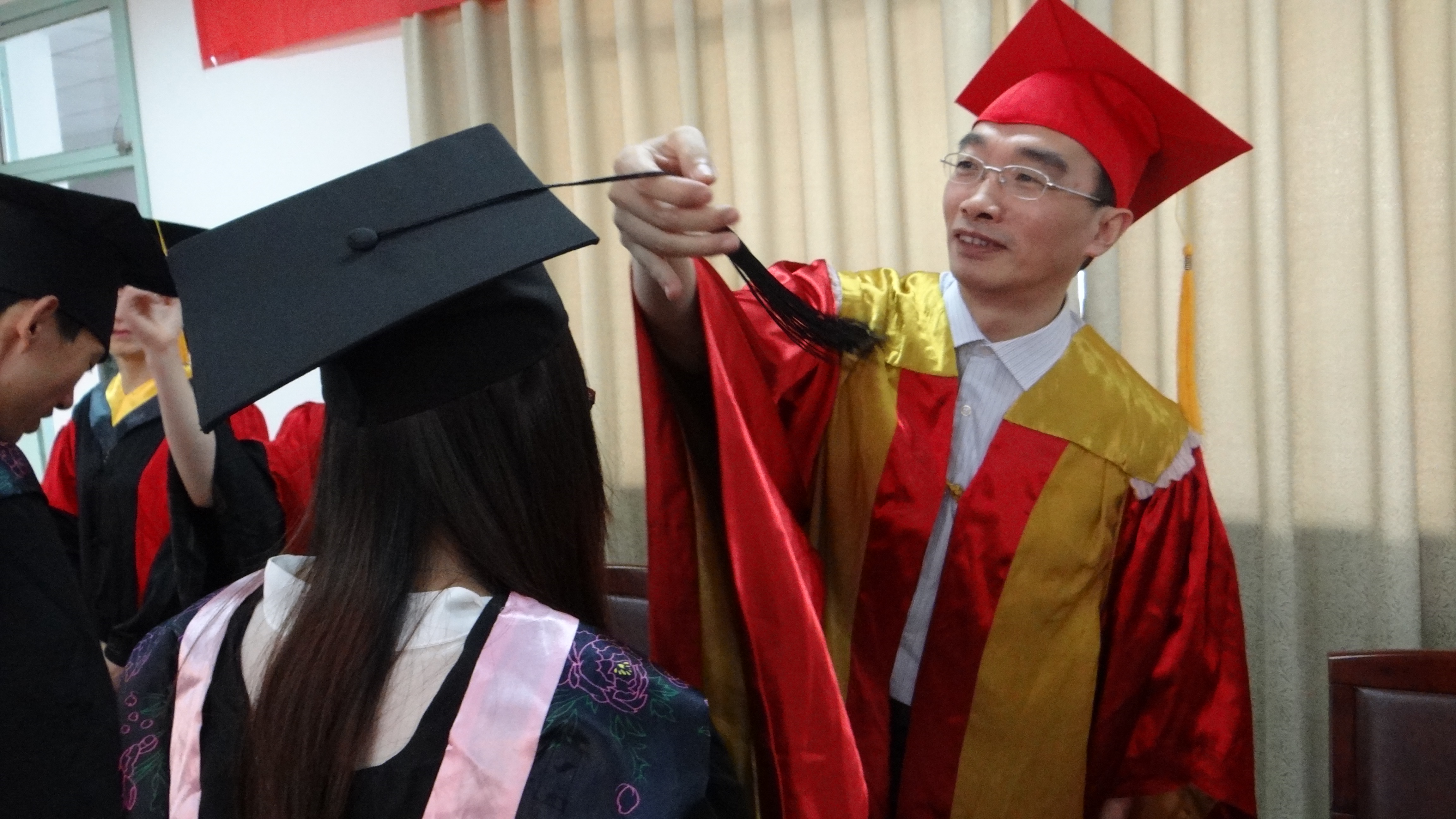 学位授予仪式上,校领导孙道胜、院领导为毕业生扶正流苏。(作者:王丽 张中 审核:林莉兰 龚乃胜)