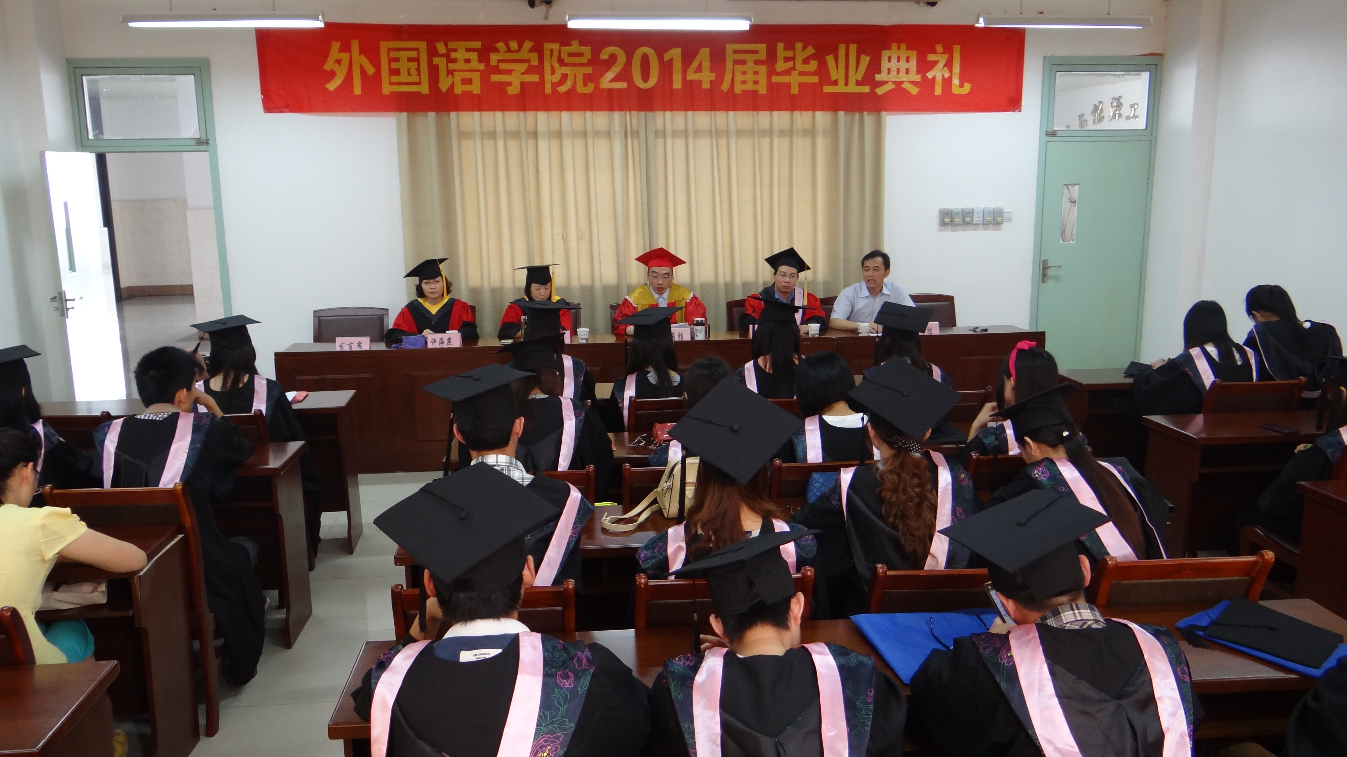 本网讯 6月26日上午,外国语学院2014届毕业典礼暨学位授予仪式在主教学楼七楼会议室隆重举行。校党委委员、副校长孙道胜出席典礼,外国语学院党政领导、辅导员、2014届毕业生及部分非毕业班学生代表参加了典礼,典礼由外国语学院党总支书记龚乃胜主持。