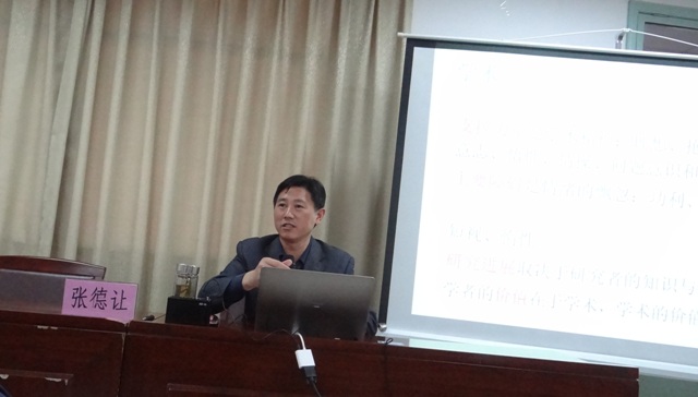 本网讯 10月19日下午,外国语学院在南区主楼七楼校会议室举行国家社科基金项目申报讲座,邀请安徽省外文学会副会长、国家社科基金项目主持人张德让教授做报告。讲座由外国语学院副院长许海燕主持,学院全体教师参加。
