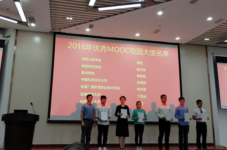 为推广安徽省网络课程学习中心平台(“e会学”) ,安徽省数字图书馆于2015年在全省40余所高校各选拔一位同学为MOOC校园大使。过去一年,我校丁若辰同学组建社团,积极组织各种活动推广MOOC和“e会学”平台,取得一致好评。优秀校园大使也是省数图对我校MOOC宣传推广工作的肯定和认可。