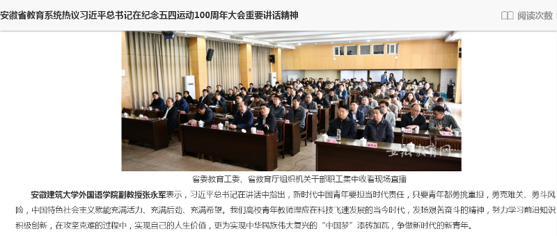 本网讯 在五四运动100周年到来之际,中共中央总书记、国家主席、中央军委主席习近平在纪念五四运动100周年大会上发表重要讲话。外国语学院高度重视学习宣传工作,组织师生及时聆听习近平总书记讲话和开展学习研讨。日前,安徽教育网刊登全省教育系统学习贯彻习近平五四讲话精神感言。作为全省高校教师代表发言,安徽建筑大学外国语学院张永军副教授的学习感言入选。