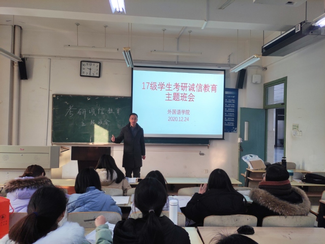 本网讯 硕士研究生考试在即,为进一步严肃考风考纪,建立良好的考试秩序,12月24日,外国语学院辅导员召开2017级各毕业班级考研学生诚信考试主题班会。