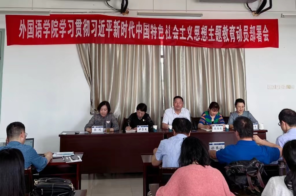 本网讯 4月19日,外国语学院党总支在主教楼1712会议室召开学习贯彻习近平新时代中国特色社会主义思想主题教育动员部署会,学校党委第一联络组、学院副处级以上干部、全体师生党员共60余人参加会议,会议由学院党总支书记余鸿主持。