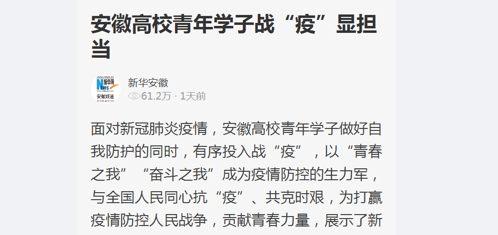 面对新冠肺炎疫情,安徽高校青年学子做好自我防护的同时,有序投入战“疫”,以“青春之我”“奋斗之我”成为疫情防控的生力军,与全国人民同心抗“疫”、共克时艰,为打赢疫情防控人民战争,贡献青春力量,展示了新时代青年学子乐于奉献、勇于担当的精神风貌。