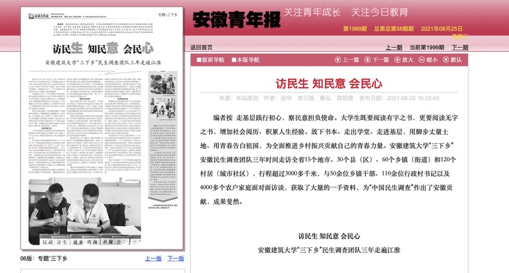 编者按 :走基层践行初心,察民意担负使命。安徽建筑大学“三下乡”安徽民生调查团队三年时间走访全省15个地市、30个县(区)、60个乡镇(街道)和120个村居(城市社区),行程超过3000多千米,与50余位乡镇干部、110余位行政村书记以及4000多个农户家庭面对面访谈,获取了大量的一手资料,为“中国民生调查”作出了安徽贡献,成果斐然。8月25日,安徽青年报对此进行了报道。