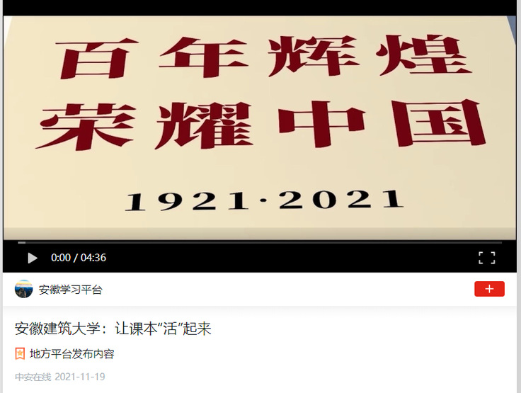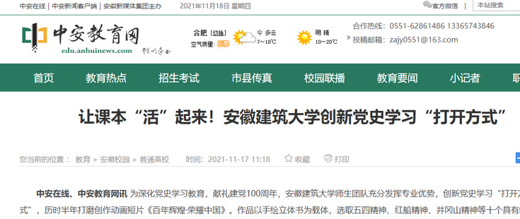 编者按 为深化党史学习教育,献礼建党100周年,安徽建筑大学师生团队充分发挥专业优势,创新党史学习“打开方式”,历时半年打磨创作动画短片《百年辉煌·荣耀中国》。11月17日,中安在线对此进行了报道。11月19日,学习强国平台进行了转载推介。