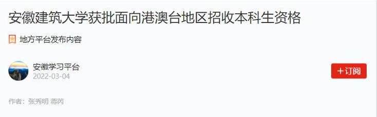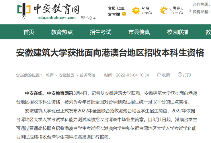 编者按:2021年8月,教育部港澳台办下达《关于对江苏大学等3所高校面向港澳台地区招收本科学生备案的函》,安徽建筑大学获批面向港澳台地区招收本科生资格。3月5日,中安在线对此进行了报道,同日,学习强国平台对此进行转载推介。