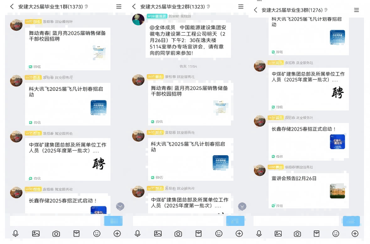 紧抓线上,工作不停。为确保寒假期间毕业生就业市场不打烊、不断线,学校扎实做好网络招聘市场建设。寒假前,学校利用24365大学生就业服务系统,举办安徽建筑大学2025届毕业生线上就业市场,春节期间保持每日更新。110家用人单位参与线上就业市场,提供就业岗位8900个。学校就业工作处官方公众号、毕业生QQ群寒假期间持续推送用人单位岗位信息及各地招才引智政策,累计发布各类就业相关信息500余条。