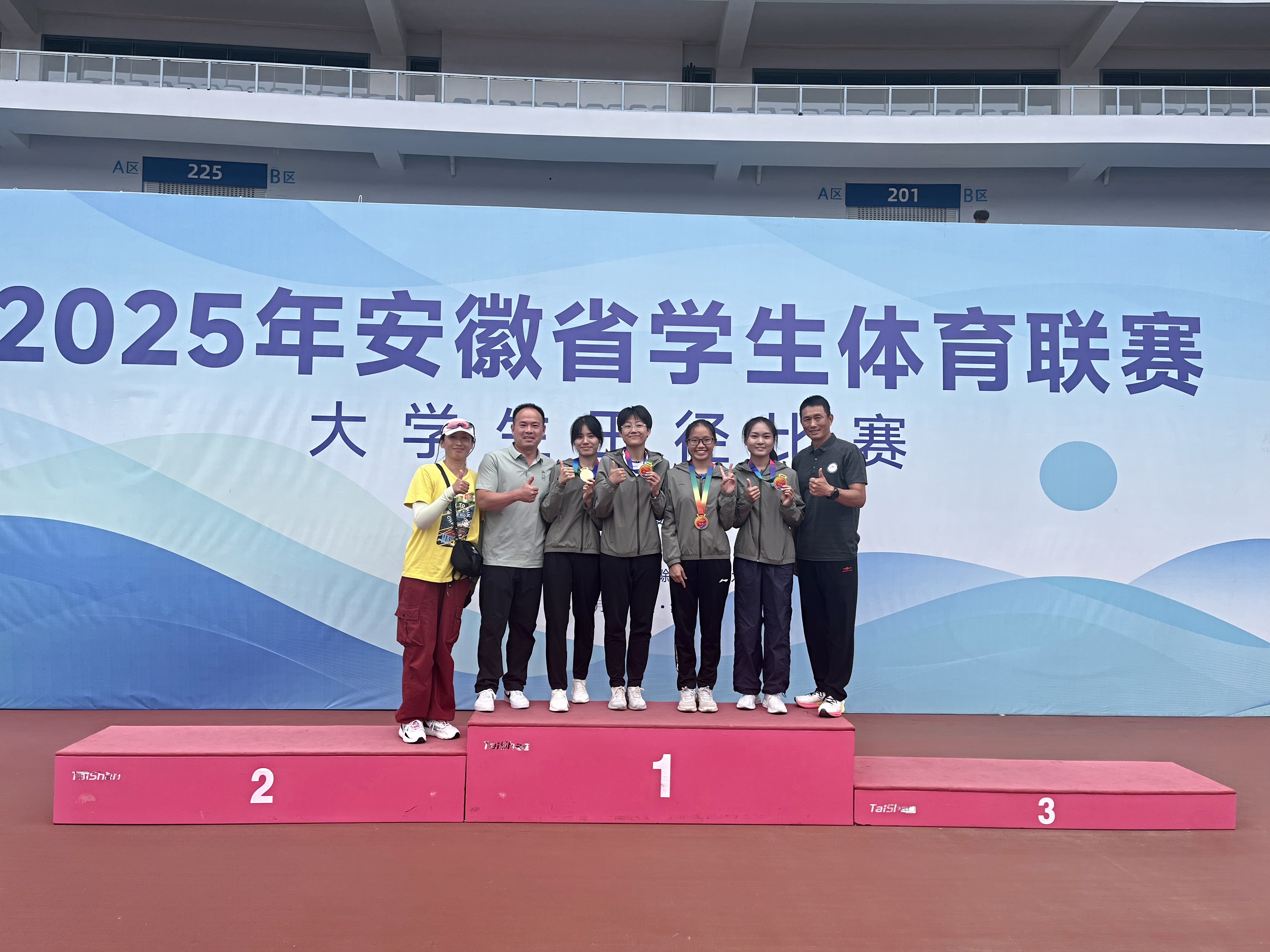 本网讯 5月27日,安徽省学生体育联赛大学生田径比赛在滁州市奥体中心圆满闭幕。本届赛事由安徽省教育厅、安徽省体育局联合主办,吸引了全省87所高校1025名运动员参赛。我校田径队15名运动健儿以卓越表现斩获3枚金牌、4枚银牌、2枚铜牌,并打破1项省纪录,最终以团体总分第三的佳绩续写辉煌。
