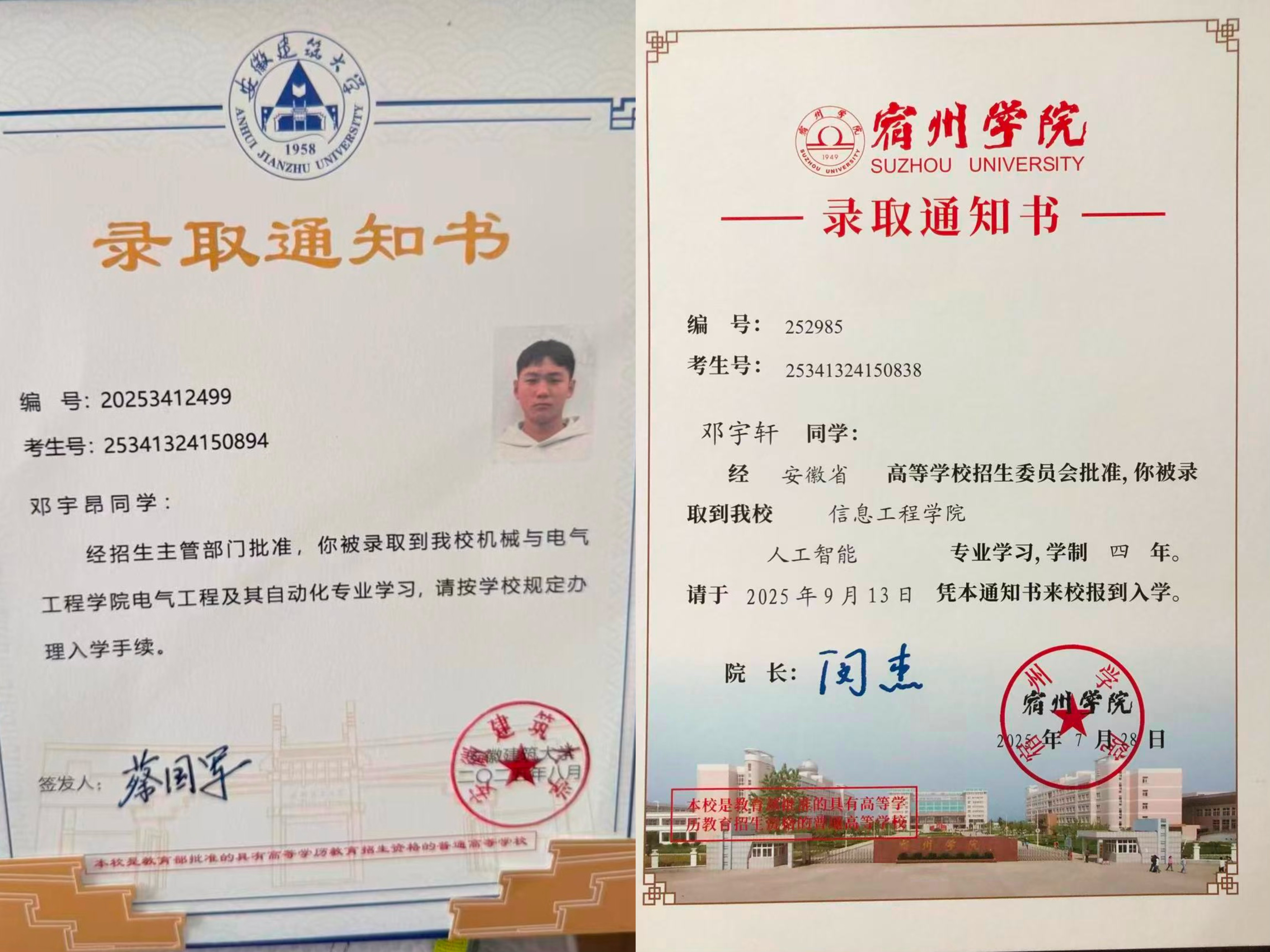 今年六月下旬,安徽建筑大学招生宣传团队赴泗县第一中学开展现场服务时,适逢兄弟俩前来咨询。学校教师结合其高考分数位次,精准分析两校优势学科,针对性推荐适配的专业,并全程指导志愿填报,最终助力两人同时考入理想院校和专业,收到了凝聚着两校教育温度的录取通知书。