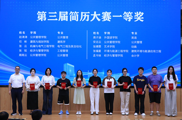 就业工作处负责人通报2025届毕业生就业工作情况。从就业去向落实率、重点领域就业占比、校企合作成效等维度,全面总结2025届毕业生就业工作亮点与经验。同时,结合当前就业市场新形势,明确2026届毕业生就业工作目标方向,为后续工作开展奠定基础。就业工作处负责人宣读安徽建筑大学第三届简历大赛表彰文件,对在大赛中脱颖而出的优秀个人与集体予以表彰。在热烈的掌声中,与会领导分别为10名第三届简历大赛一等奖获得者及4个优秀组织单位颁奖,激励全体毕业生以优秀为榜样,打磨求职核心竞争力,为即将到来的校招季做好充分准备。