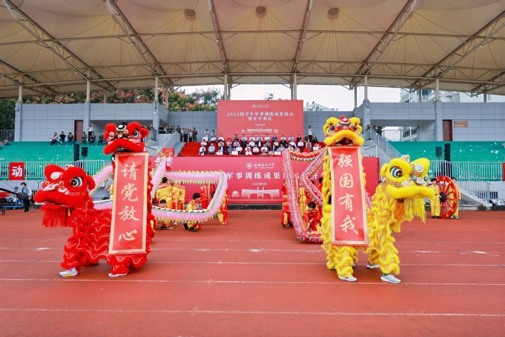 军事训练成果展示环节落幕后,精彩纷呈的文艺节目轮番登场。乐队以一曲激情澎湃的《鲜花》点燃全场;新生代表献唱的《我相信》,歌声高亢有力,尽显青春朝气;戏曲串烧演绎《天仙配》《女驸马》等经典选段,表演细腻传神,引人入胜;更有轩辕滚车、舞龙舞狮等传统项目接连亮相,赢得在场新生的热烈掌声。青春律动和传统文化巧妙融合、交相辉映,展现了学校兼容并蓄、优美生动的美育画卷。