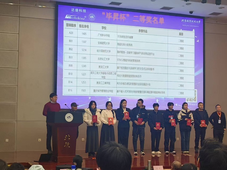本网讯 近日, 第十五届“毕昇杯”全国大学生电子设计新技术应用创新竞赛总决赛在北京航空航天大学圆满落幕。来自全国25个省份,150余所高校的近600余支队伍经过激烈的初赛选拔,最终125个团队成功晋级总决赛。经过激烈角逐,由电子与信息工程学院徐荃和颜普两位老师指导的陈红年、刘彪、李金洋和吴杨妙姝同学荣获全国二等奖。