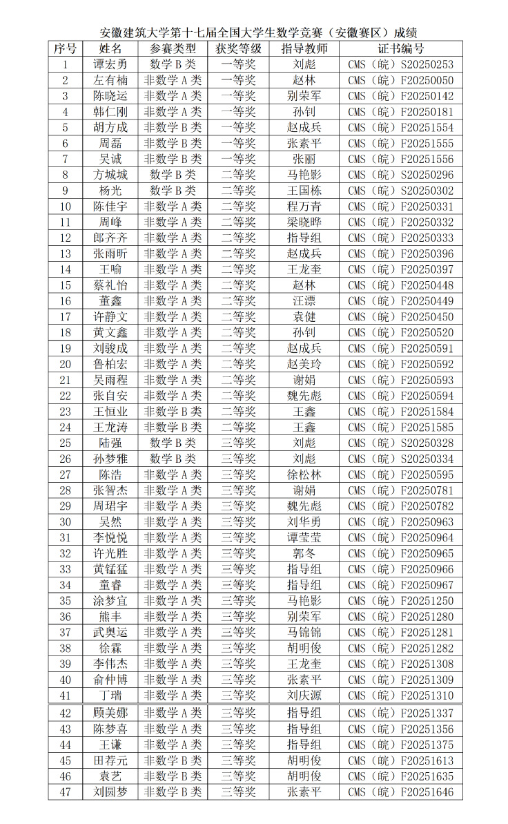 本网讯 近日,中国数学会公布了第十七届全国大学生数学竞赛(安徽赛区)成绩。学校数理学院、环境与能源工程学院、电子与信息工程学院、机械与电气工程学院、经济与管理学院等7个学院共47名学生获得省级奖项,包括一等奖7项,二等奖18项,三等奖22项。其中数理学院24级谭宏勇获得数学B类一等奖,环境与能源工程学院22级左有楠等6位同学获得非数学A、B类一等奖。