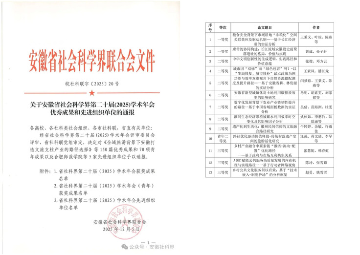 在安徽省社会科学界联合会第二十届学术年会评选中,学校斩获一等奖2项、二等奖7项、三等奖3项,青年二等奖1项,获奖总数居省属高校前列。学校将继续秉持严谨治学精神,鼓励师生立足学科优势,服务国家与地方战略,深化重点领域研究,提升科研创新与成果转化效能。