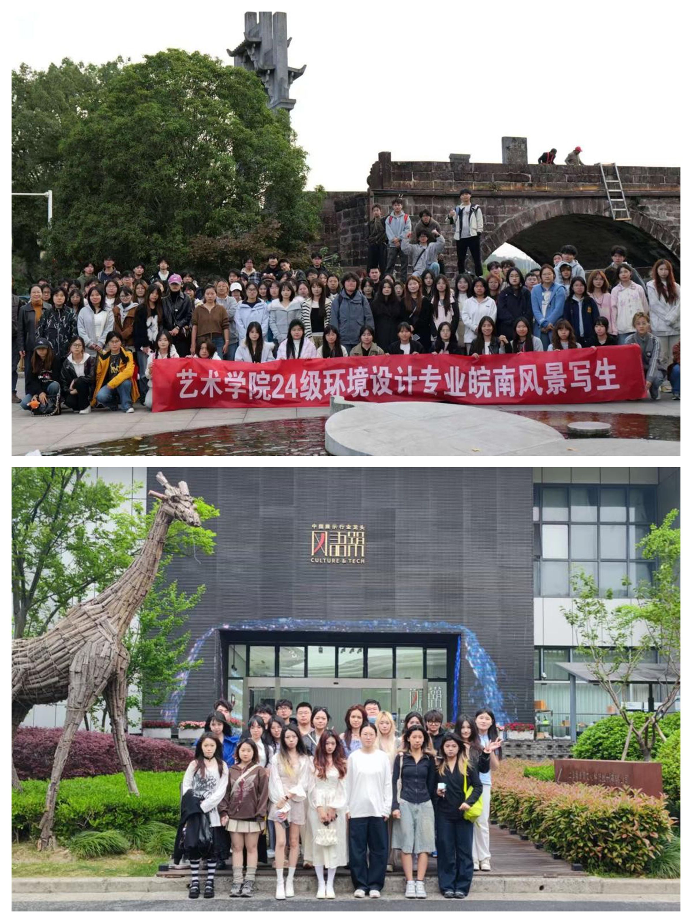 异地研学拓宽视野:组织低年级学生赴皖南开展文化采风与艺术写生,深入古村落考察传统建筑形制与空间布局,收集一手设计素材;高年级则赴江浙沪等设计产业前沿城市,参访知名设计机构、知名高校,了解智能建造、绿色家居、数字化设计等新兴领域的发展动态。通过沉浸式学习与行业精英面对面交流,学生不仅拓宽了专业视野,更激发了创新思维与跨界融合意识。