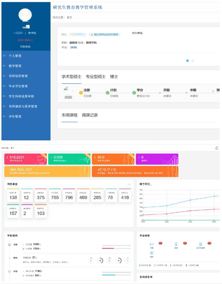 数字赋能管理,服务效能提升。“十四五”期间,研究生教育管理信息系统完成从功能补全到智能升级的跨越。通过优化排课选课、师生互选、学位申请等核心模块,重点实现了开题、中期考核等关键环节的网络化全流程管理,有效破解了师生“办事繁、跑腿多”的痛点,管理服务效率与师生满意度大幅提升。