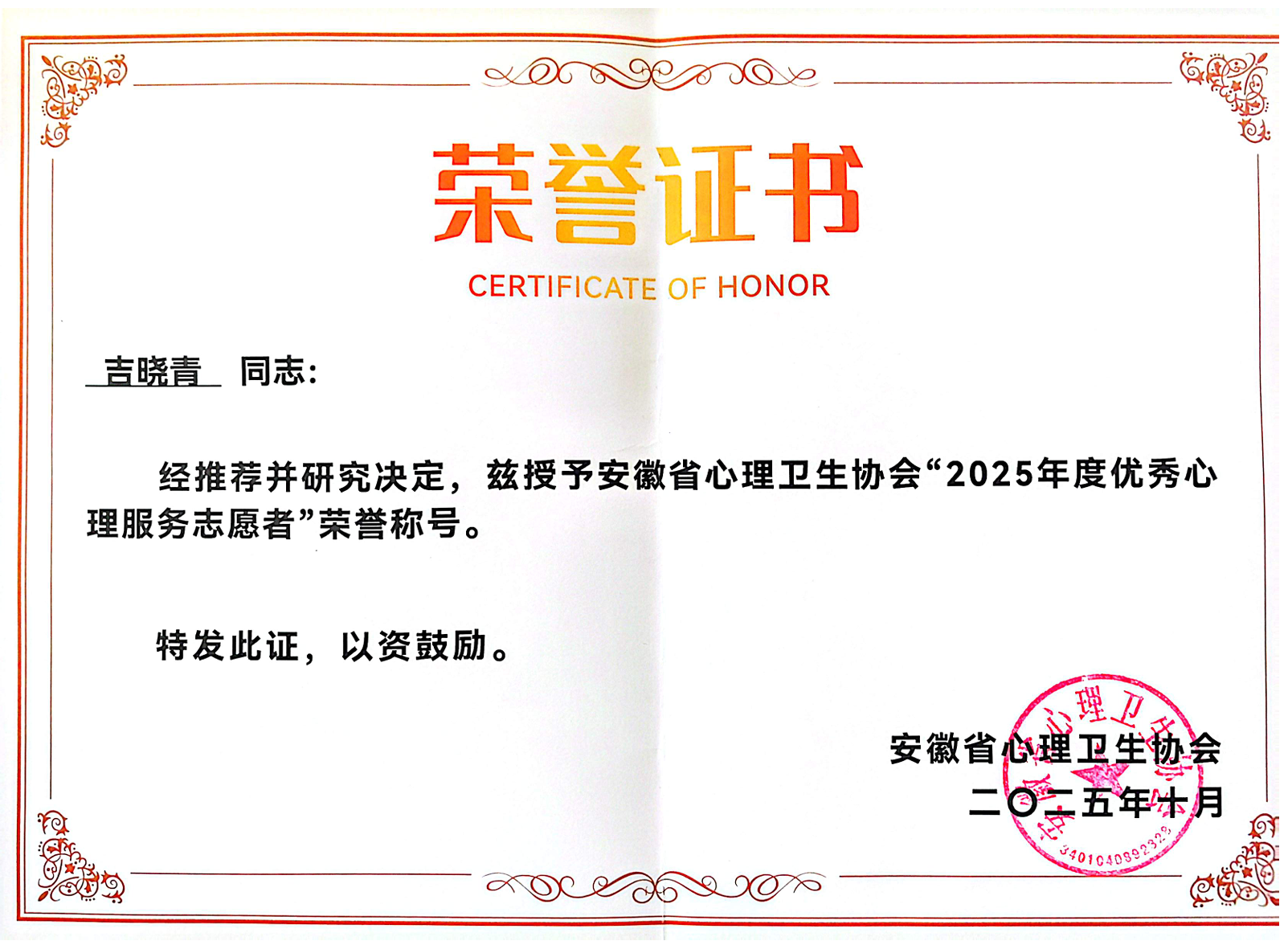 吉晓青老师荣获2025年度优秀心理服务志愿者称号