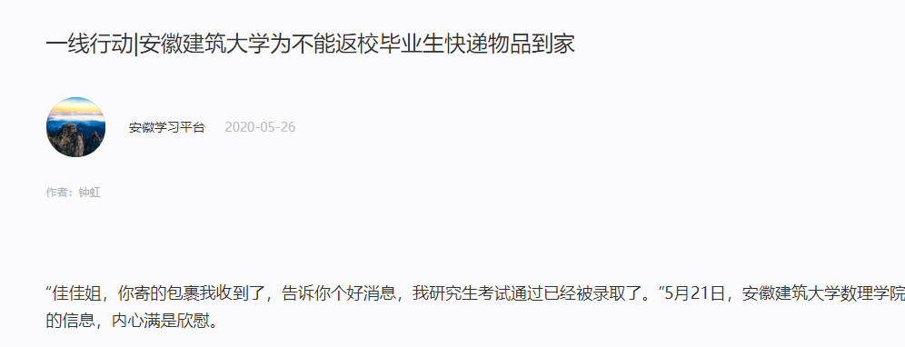 从5月中旬至今,安徽建筑大学为不返校毕业班学子提供了快递打包服务,学子们在家就收到了自己的个人物品,虽然不能返回母校有些遗憾,但是疫情之下保障生命安全是最重要的。