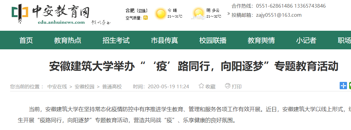 编者按:近日,我校以线上形式,组织学生开展“疫路同行,向阳逐梦”专题教育活动,营造共同战“疫”、乐享健康的良好氛围。 活动引起了媒体的关注,中安在线对此进行了报道,学习强国平台对此进行了转载推介。