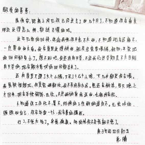 本网讯 为弘扬中华民族传统美德、传承优秀家风,引导同学们感恩父母、热爱家庭,经管学院开展五个一”系列之“写一封家书寄一份深情”资助主题教育活动。活动中,同学们纷纷拿出纸笔,用最质朴的方式,写下对家人想说的心里话。