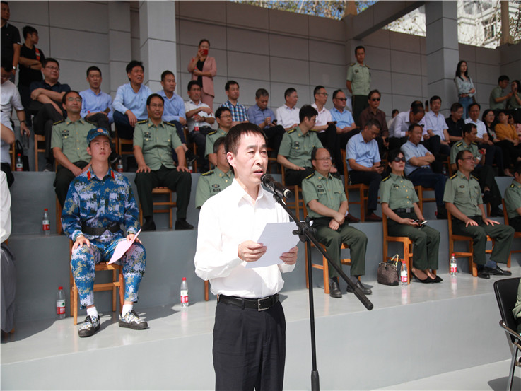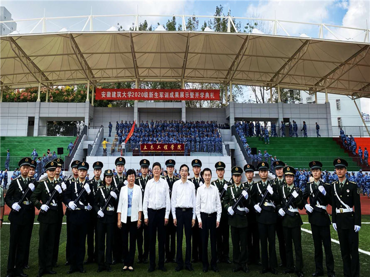本网讯 秋风飒爽,丹桂飘香。9月27日,安徽建筑大学2020级学生军训成果展示暨开学典礼在南校区田径场举行。校领导方潜生、孙道胜、吕萍、成祖德、黄显怀、丁克伟,中国人民解放军陆军炮兵防空兵学院三大队政治委员金伟上校出席典礼。军训工作领导小组成员,各学院党政负责同志,学校有关职能部门负责人,全体新生辅导员及2020级全体学生参加典礼。典礼由校党委副书记吕萍主持。