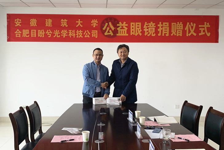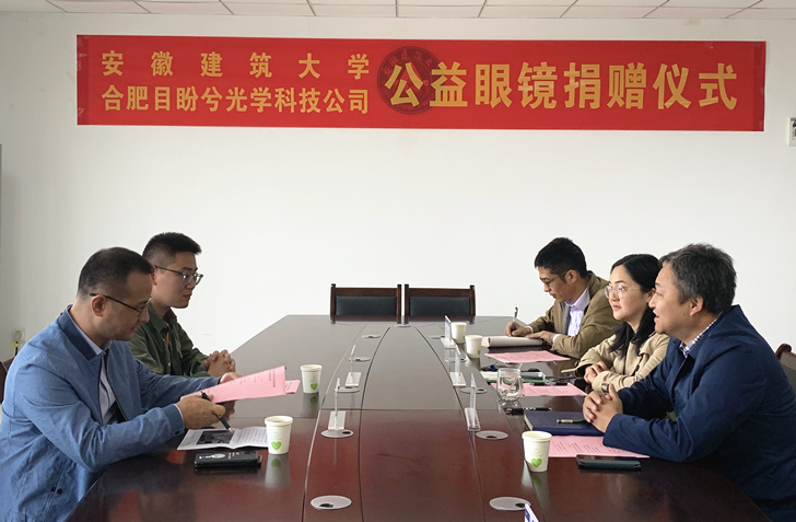 本网讯 奉献爱心、点亮视界,10月21日下午,安徽建筑大学和合肥目盼兮光学科技有限公司在南校区实验综合楼16楼第一会议室共同举行公益眼镜捐赠仪式。合肥目盼兮光学科技有限公司总经理王勇、配镜师潘志虎,学生处处长斯方龙、副处长汤娜及相关工作人员出席了捐赠仪式。