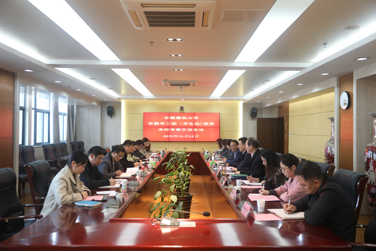 交流中,陈行对我校学工部的到来表示热烈欢迎。安徽职业技术学院学生处处长潘瑞春从迎新、入学教育、日常管理、党史学习教育等方面就开学以来两校联合培养学生工作开展情况进行了详细介绍。与会人员围绕思想教育、学生管理、资助育人、辅导员队伍建设、易班共建、学籍档案管理及下一步工作的无缝对接、精准落实进行了深入的交流。