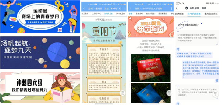 2021年,学生处秉持“搭建有情怀的平台 服务学生成长成才”的理念,将传播优质内容作为网络育人的重心,努力提升传播效果。本着坚持原创、服务学生的理念,紧密结合时事热点和校园热点,通过各类易班新媒体平台持续推进优质网络内容供给,为广大师生提供贴近校园生活的建大人、建大事,打造“易海‘易’家人”校园文化品牌。在微信公众号号开设“易起学党史”“易建拾光”“小憩易刻”“疑问易答”“易起吃叭”“易师心语”等专题14个,推进易班校本化深度融合;推送“逐梦新时代 奋进建大人四史宣讲”“青春告白祖国”“最美搬迁季”“萌新早知道”“榜样力量”优秀毕业生专访等内容,开展爱国爱校教育,加强榜样示范引领。多篇优质网络推文如“我在安建大,表白祖国”“注意啦!新生军训成果展示暨开学典礼看这里!”“萌新早知道│开学安全小贴士”“建大拼图│你真的够‘拼’吗?快过来挑战一下吧!”等被安徽省教育厅、安徽建筑大学官微转载宣传。聚焦建党百年、奥运精神、开学指南、考研等内容,在“易班·今日校园”主页制作易班轻应用广告18期,和学生关切紧密结合。通过易班校园号平台开通“你在读什么书”“我在易班上自习”“春分摄影比赛,捕捉校园春景”“晒一晒我的暑假生活”“运动风采易起拍”等话题10个,平均每个话题参与讨论近200人次,进一步提升学生网络素养,繁荣校园网络文化。2021年,学生处微信公众号发布推文298篇、“安徽建筑大学易班发展中心”官方QQ发布动态679篇、易班校园号发布动态和文章552篇。同时,以“校园百事通(易小班)”为抓手加强校园互动,提供校内优质问答,更新开学报到注意事项、评奖评优、考研等专题,累计解答师生提问57065人次。