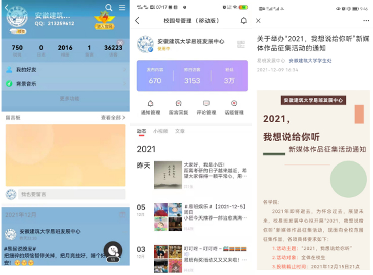 校易班发展中心秉持“搭建有情怀的平台 服务学生成长成才”的理念,将传播优质内容作为网络育人的重心,努力提升传播效果。本着坚持原创、服务学生的理念,紧密结合时事热点和校园热点,通过各类易班新媒体平台持续推进优质网络内容供给,为广大师生提供贴近校园生活的建大人、建大事,打造“易海‘易’家人”校园文化品牌。在微信公众号号开设“易起学党史”“易建拾光”“小憩易刻”“疑问易答”“易起吃叭”“易师心语”等专题14个,推进易班校本化深度融合;推送“逐梦新时代 奋进建大人四史宣讲”“青春告白祖国”“最美搬迁季”“萌新早知道”“榜样力量”优秀毕业生专访等内容,开展爱国爱校教育,加强榜样示范引领。多篇优质网络推文如“我在安建大,表白祖国”“注意啦!新生军训成果展示暨开学典礼看这里!”“萌新早知道│开学安全小贴士”“建大拼图│你真的够‘拼’吗?快过来挑战一下吧!”等被安徽省教育厅、安徽建筑大学官微转载宣传。聚焦建党百年、奥运精神、开学指南、考研等内容,在“易班·今日校园”主页制作易班轻应用广告18期,和学生关切紧密结合。通过易班校园号平台开通“你在读什么书”“我在易班上自习”“春分摄影比赛,捕捉校园春景”“晒一晒我的暑假生活”“运动风采易起拍”等话题10个,平均每个话题参与讨论近200人次,进一步提升学生网络素养,繁荣校园网络文化。全年微信公众号发布推文298篇、“安徽建筑大学易班发展中心”官方QQ发布动态679篇、易班校园号发布动态和文章552篇。同时,以“校园百事通(易小班)”为抓手加强校园互动,提供校内优质问答,更新开学报到注意事项、评奖评优、考研等专题,累计解答师生提问57065人次。