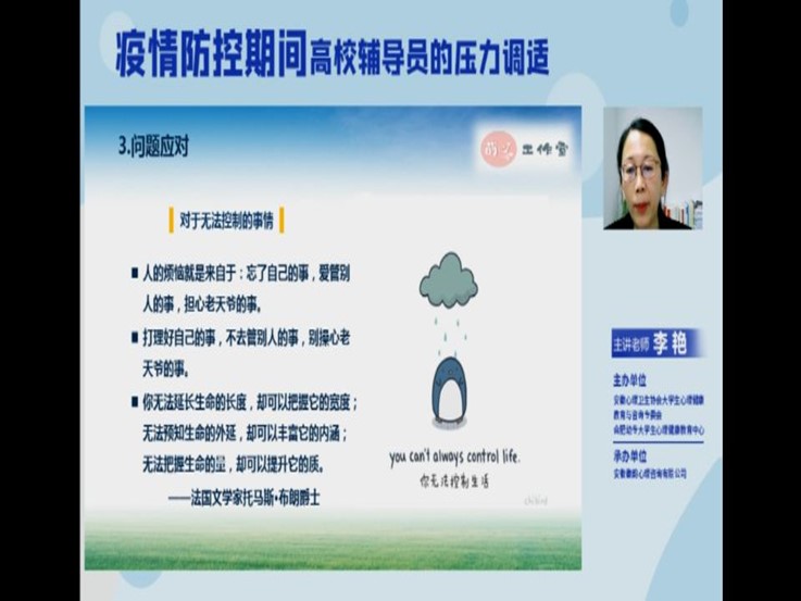 主讲人合肥工业大学李艳副教授围绕如何评估心理压力,如何有效预防、积极应对压力,提升抗压能力等方面,在线为心理辅导站老师心理赋能。