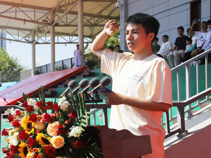 全体新生共同佩戴校徽。来自电子与信息工程学院的刘旭带领2022级全体新同学进行了入学宣誓,用掷地有声的誓言,表达“请党放心,强国有我”的豪情壮志。