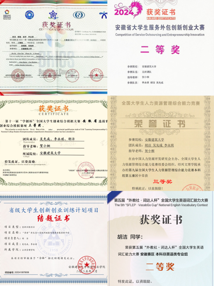 令她印象最深刻的比赛是学创杯比赛,也是所有比赛的开始。起初,胡洁和队友们对创业模拟的全流程操作几乎一无所知,从公司注册、产品研发销售到财务规划都毫无头绪。为了补齐短板,她们成了B站的常客,一有空就刷创业模拟相关教学视频,把关键知识点一条条记在本子上;每天课后,几个人便扎进教学楼的自习室,对着模拟系统反复练习,常常练到教学楼熄灯才收拾东西离开。起初,由于对市场数据敏感度不足,她们的营销策略频频碰壁。后来她和队友摸索出“数据反推决策”的思路,通过分析同行定价区间、消费者反馈数据,及时调整产品定价和推广渠道。经过多轮模拟调整,她们的团队最终在模拟周期内实现了盈利,成功拿下安徽省选拔赛三等奖。这场比赛的首次成功,为她们团队注入了强劲动力,此后她们越战越勇。竞赛经历为她的保研简历增添了亮眼的色彩。